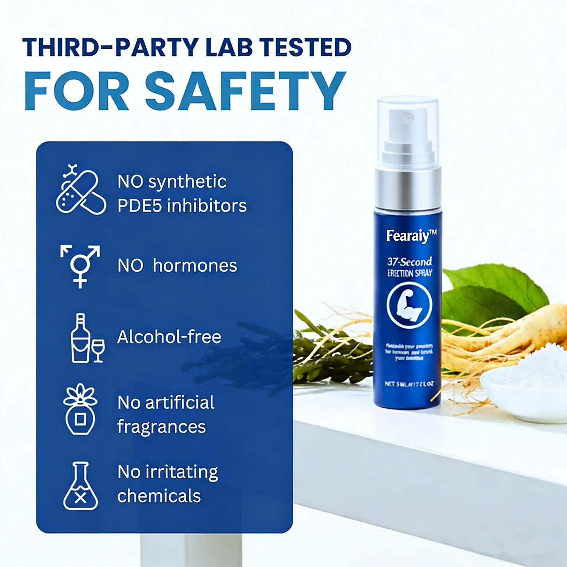 Contains NO synthetic PDE5 inhibitors (like Sildenafil), hormones, alcohol, artificial fragrances, or irritating chemicals. Designed for topical use, third-party lab tested for safety. Complete ingredient list and lab test reports available