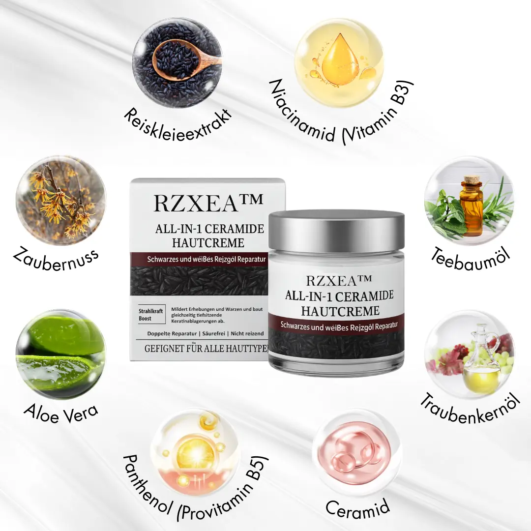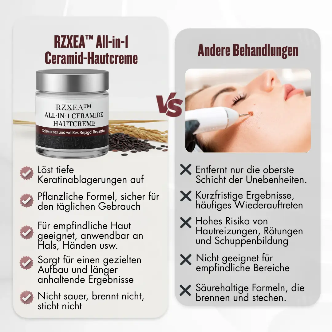 Deshalb haben wir die RZXEA™ All-in-1 Ceramide Hautcreme entwickelt – eine sanfte botanische Formel, die erhabene Erhebungen weich macht, tiefe Keratinablagerungen abbaut und hartnäckige dunkle Flecken aufhellt – völlig säurefrei, ohne Brennen, ohne Schälen, ohne Reizungen.