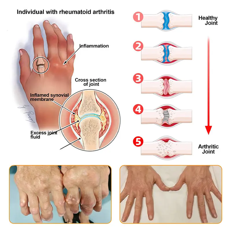 Rheumatoid Arthritis (RA) is a chronic inflammatory disease that causes inflammation and damage to the joints due to the autoimmune system attacking the synovial lining of the joints. Rheumatoid arthritis is characterized by joint pain, swelling, and stiffness, and usually occurs in small joints such as the fingers, wrists, knees, and ankles, but may affect other large joints as well.