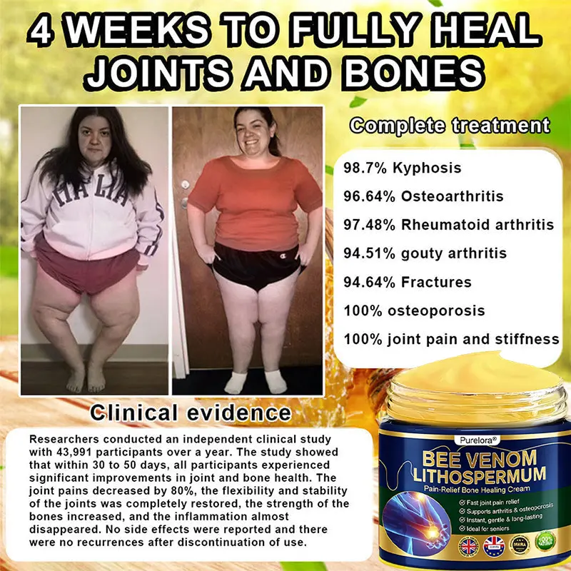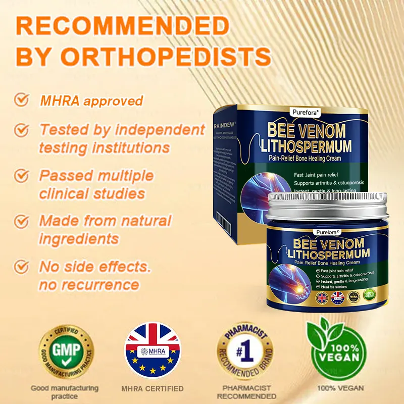 Purelora® BEE VENOM LITHOSPERMUM Pain-Relief Bone Healing Cream This product is certified and recommended by MHRA, meeting their high standards to effectively relieve pain and promote bone health. Approved by orthopedic doctors, it relieves pain within 5 minutes, restores joint mobility in 7 days, and significantly improves arthritis symptoms in 4 weeks. Choose our BEE VENOM LITHOSPERMUM Pain-Relief Bone Healing Cream and enjoy reliable results and a pleasant experience with confidence.