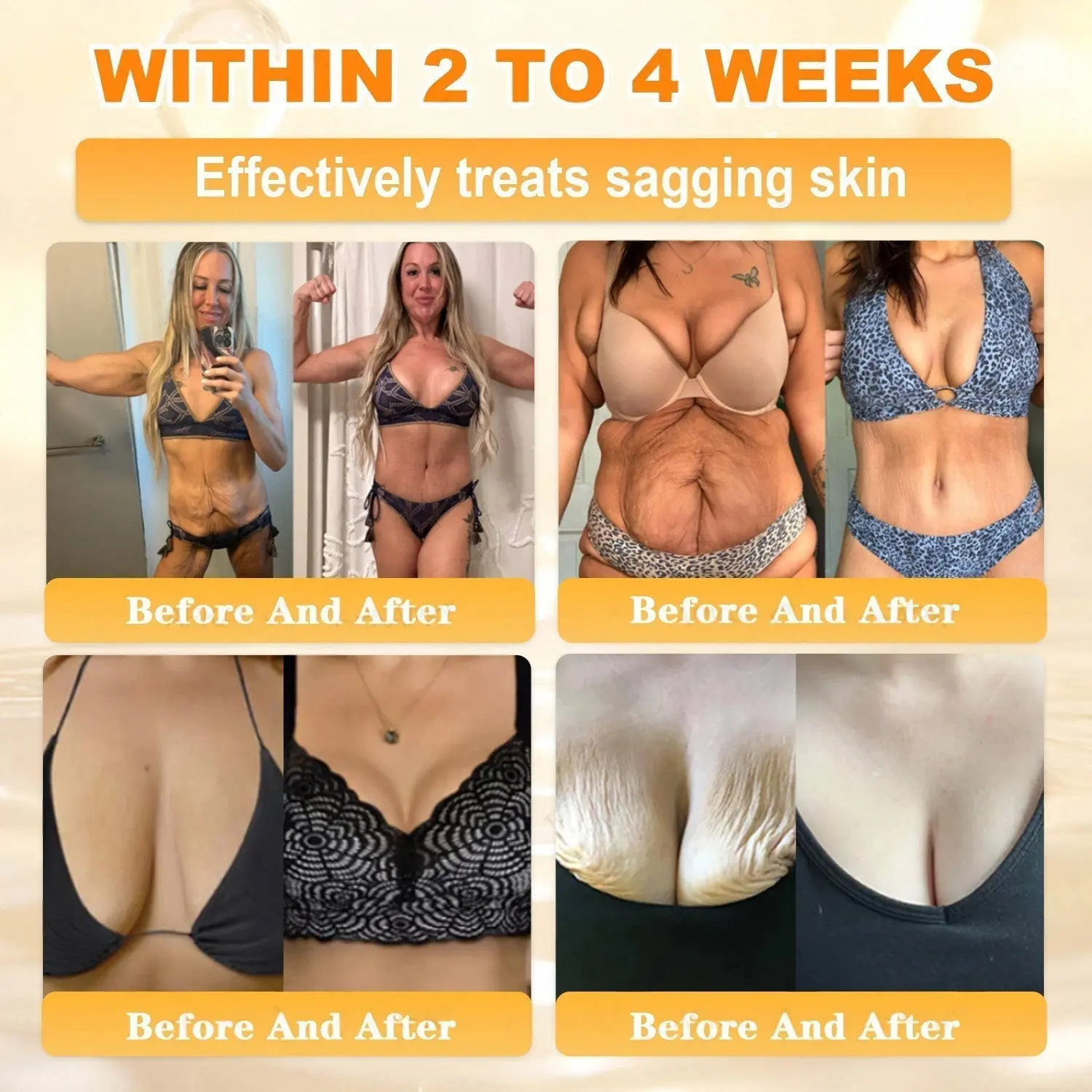 As we age, our skin naturally loses collagen, causing areas like the chest and buttocks to become less firm and elastic. Collagen peptides work deep within the skin to rebuild the collagen network and restore strength and bounce. Bee Venom peptides help stimulate new collagen, while hyaluronic acid and grass-fed tallow (rich in stearic acid) deeply moisturize and nourish the skin. Shea butter and jojoba oil boost smoothness, plumpness, and elasticity, leaving the skin feeling firmer and more toned. With regular use, 95% of users noticed a visible lift and reduction in sagging around the chest and buttocks. It also helps tighten loose skin after weight loss or childbirth and fades fine lines on the face and neck, revealing a firmer, younger-looking appearance.