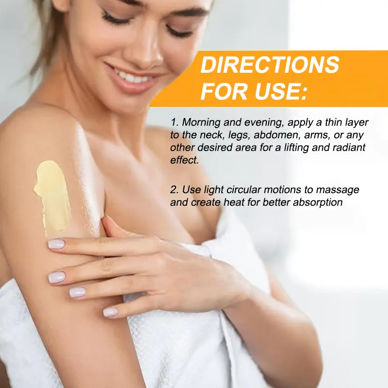 - Morning and night, smooth a thin layer over your neck, legs, abdomen, arms, or any desired area for an enhanced lift and glow.