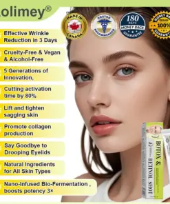 Top CA dermatologists consider Rolimey® Botox & Vita-A Retinol Shot a breakthrough in at-home anti-aging skincare. Clinically supported and recognized by leading dermatology associations, regular use has been shown to reduce wrinkles, improve skin firmness, and stimulate collagen production. Experts agree it’s a safe, non-invasive alternative to costly professional treatments, allowing anyone to enjoy professional-level anti-aging results at home.