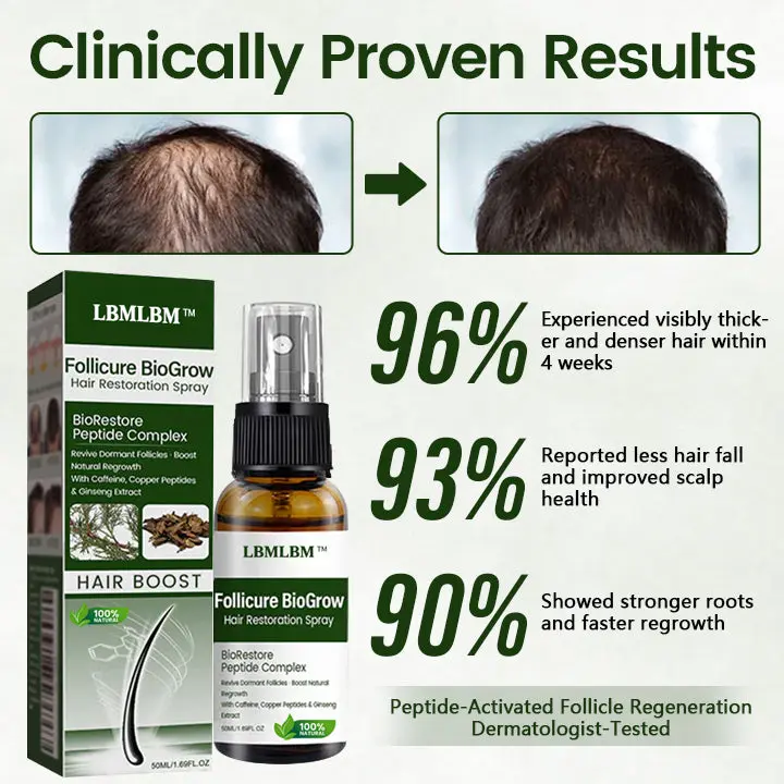 👉 US clinical studies reveal that after age 30, over 65% of men and 40% of women show signs of hair loss. This isn’t just aging—your hair follicles are going dormant! With LBMLBM™ Follicure BioGrow Hair Restoration Spray, users restored thicker, stronger, and healthier hair — all backed by clinically proven peptide science.