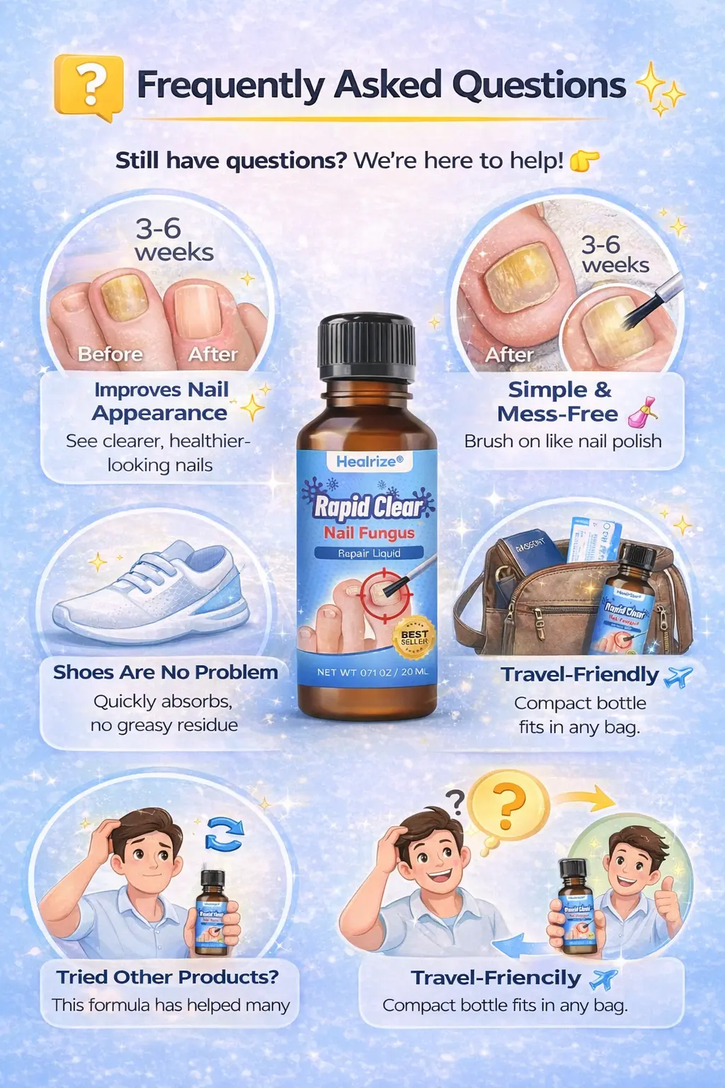 “From wearing closed-toe athletic shoes for years, my toenails turned yellow and thick. I tried all kinds of creams — they were messy, and I had to touch the infected area with my fingers, which felt really unhygienic. Healrize® is completely different — it’s like applying nail polish, just brush it on and you’re done. Clean and convenient. After consistent use, my nails are noticeably clearer. This is the only product I’ve ever used that feels like ‘self-care’ rather than ‘medical treatment’!” — Kevin ⭐⭐⭐⭐⭐