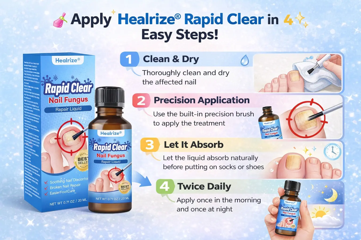 “I’ve struggled with nail fungus for years and tried countless treatments with no luck. Healrize®’s nail polish-style design caught my eye — it’s compact and portable, perfect for business trips and travel, and you never have to touch the infected area when applying. I use it twice a day, morning and night, and my nails have shown real improvement. This is the first time nail fungus care has ever felt this elegant!” — Kristen ⭐⭐⭐⭐⭐