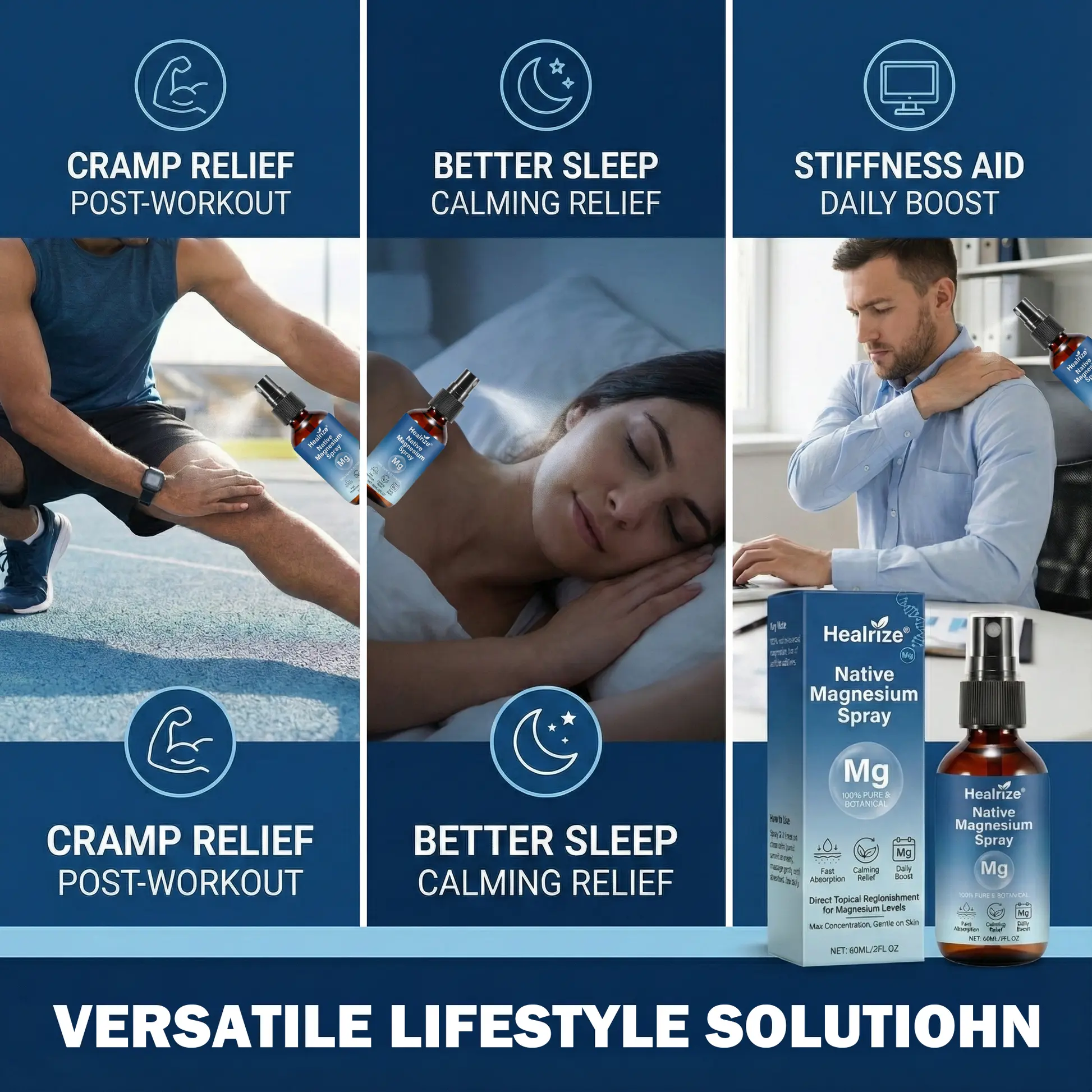 Post-run calf tightness used to ruin my nights—half the time I’d wake up mid-cramp, wincing in pain. Then I grabbed this Healrize® Native Magnesium Spray: I spritz 3 times on my calves right after my run, and within 90 seconds the tension starts melting away. No more stiff, achy legs when I wake up—it’s like the post-workout soreness never even happened. The fast absorption is insane, and it’s so gentle on my skin (no sticky residue, either!). If you’re a runner dealing with cramping or tightness, this spray is a must-have—it’s become my non-negotiable post-workout step. 10/10, will never run without it again.——Mark D.(age: 45)