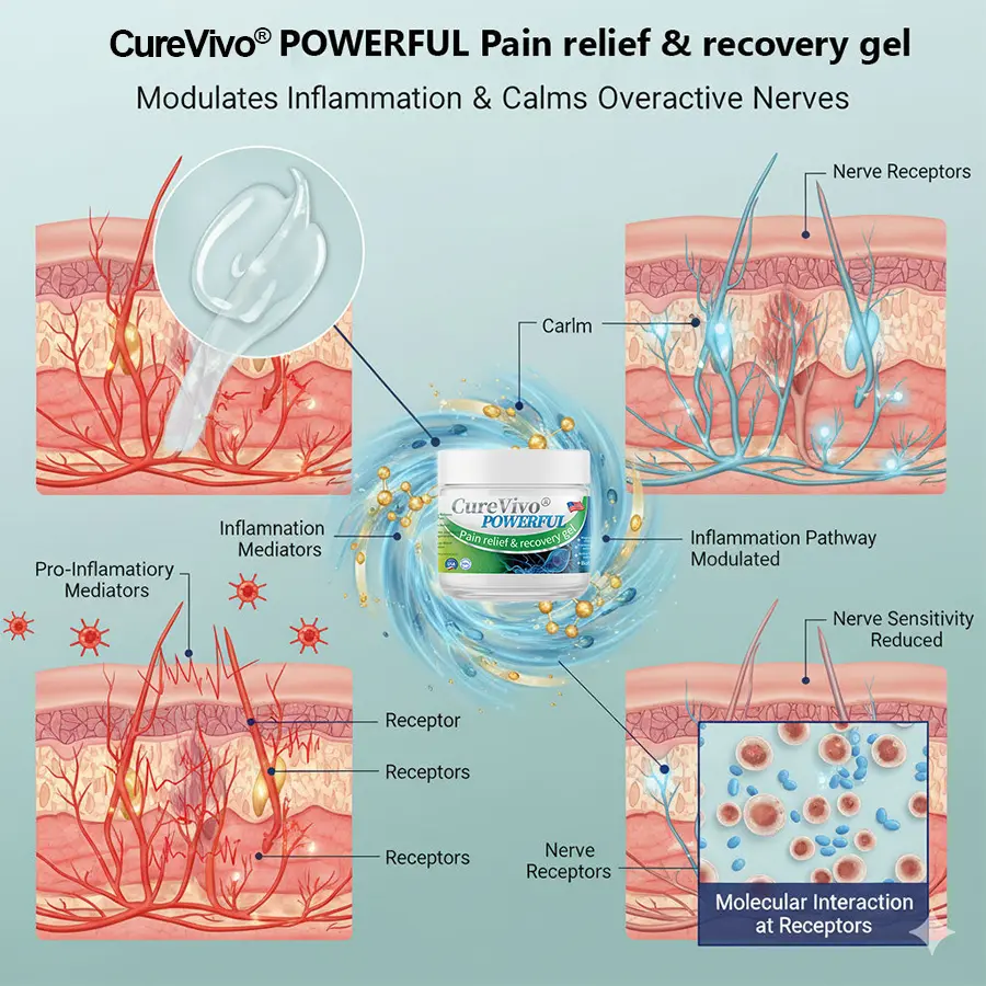 When applied to the skin, CureVivo® Powerful Pain Relief & Recovery Gel can interact with receptors involved in nerve signaling and inflammation. This interaction can help modulate inflammatory pathways and soothe overactive nerves, potentially reducing the release of pro-inflammatory molecules that contribute to nerve irritation, joint swelling, and soft tissue inflammation.