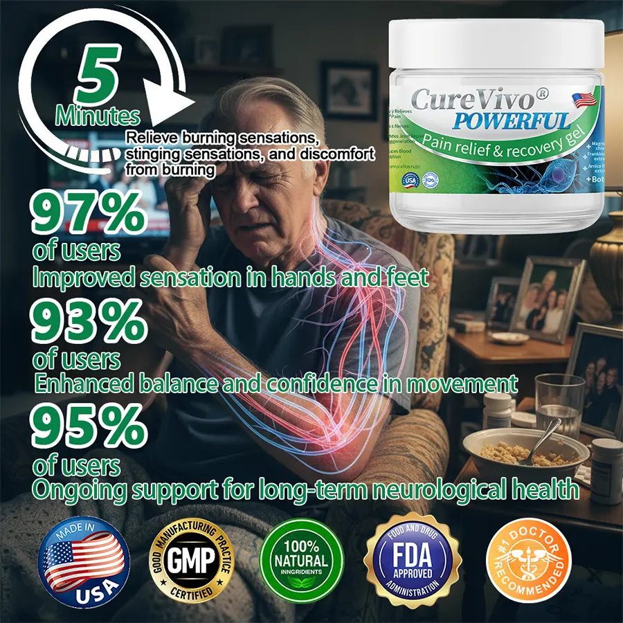 Previously, I had to take medication to fall asleep, but the burning and tingling sensation in my feet made me dread bedtime. Every night, staring at the ceiling, my thoughts would drift to all the time I was missing with my grandchildren. Massages, hot baths, medication… they only provided temporary relief and didn’t solve the problem at all.Then one day, I tried CureVivo® Powerful Pain Relief & Recovery Gel. As soon as I applied it, I felt a wonderful soothing sensation, and the burning and tingling slowly disappeared. That night, I finally got a good night’s sleep.A few days later, the effects were even more noticeable: I could walk, stand, and even play with my grandchildren. The pain in my feet was almost gone, and I felt completely relieved.CureVivo® Gel directly targets the source of nerve pain, soothing burning and tingling sensations, relaxing muscles, and reducing inflammation. It absorbs quickly and is easy to use; I carry it with me and use it every day.In just one week, my life completely changed—no more insomnia, no more pain, and I can truly enjoy spending time with my family.— A satisfied user