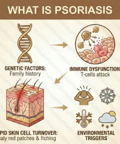 - Immune Dysfunction: Core mechanism: A dysregulated immune system, where T-cells attack the body’s own skin cells. Their proliferation accelerates to 3–4 days (normal is 28 days), leading to scales and red patches.