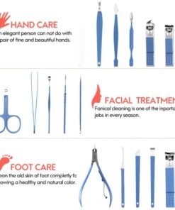 - Package include: 1x big nail clippers, 1x nail clippers, 1x diagonal pliers, 1x glass file, 1x dead skin pliers, 1x toothed scraper, 1x flat mouth knife, 1x oblique knife, 1x A pick, 1x off knife, 1x dead skin fork, 1x nail file, 1x eyebrow scissors, 1x eyebrow clip, 1x acne needle